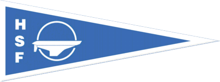 The flag of Holmestrand Seilforening from Holmestrand is blue with a white edge and the initials and badge in white.