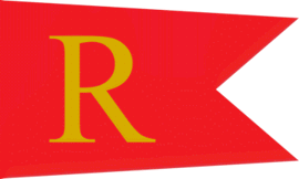 The flag of Risør Seilforening from Risør Municipality is a red swallowtail with a golden letter R.