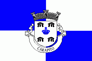 Shield Argent on heart point a Marian crown Azure flanked in each corner by a dolmen Sable. Mural crown Argent with visible four towers (town rank) and white scroll with inscription in black capitals: "CARAPITO". Usually entities of village rank have monocoloured flags.