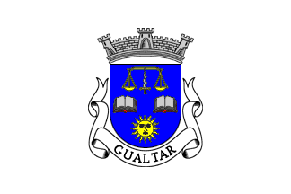 Shield Azure, two open books Argent bound Gules in fess, in chief weighting scales Or balanced on a wavy bladed sword Argent hilted Or, in base a radiant sun with face Or. Mural crown Argent with three visible towers (village rank) and white scroll reading in black upper case serifed letter "GUALTAR".