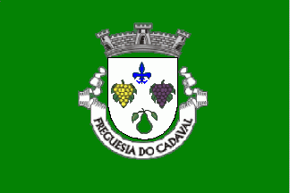 Shield Argent, two grape bunches leafed Vert, the one at dexter fructed Or and the one at sinister fructed Purpure, in base a pear Vert, on central chief a fleur-de-lis Azure. Mural crown Argent with three visible towers (village rank) and white scroll with inscription in black capitals: "FREGUESIA DO CADAVAL".
