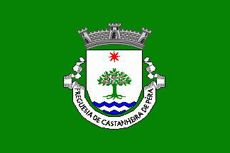 Shield Argent with base wavy of Azure and Argent, a chestnut tree eradicated Vert fruited Gules capsuled Argent, in central chief an 8-point-star Gules. Mural crown Argent with three visible towers (village rank) and white scroll with inscription in black initials "FREGUESIA DE CASTANHEIRA DE PERA".