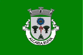 Shield Argent, a Latin fleury fitchy Gules flanked by two wheat sheaves Vert tied Or, in chief a crown Or nimbed Azure, in base an oak branch Vert fruited of the same. Mural crown Argent with three visible towers (village rank) and white scroll with inscription in black initials "ALCARIA RUIVA".