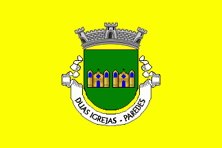 Shield Vert, two churches Or with port and windows Azure and set in fess. Mural crown Argent with three visible towers (village rank) and white scroll with inscription in black capitals "DUAS IGREJAS - PAREDES".