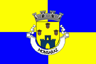 Shield Or, in base a gatehouse issuant Azure masoned Sable and crowned by an embattled turret of the same flnked by three inescutcheons topped by coronets and ordered 1:2. Mural crown Argent with four visible towers (town rank) and white scroll readinfg in black initials: "MONSARAZ".
