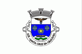 Shield Azure with base wavy of Argent and Vert, issuant from base a boat Argent garnished Gules and Azure, chief Argent charged with a goshawk Proper, holding a quina, a blue shield charged with five bezants in quincunx, a 5-point star radiant Or flanked by two heraldic fountains. Mural crown Argent with three visible towers (village rank) and white scroll with inscription in black initials: "LUZ - SANTA CRUZ DA GRACIOSA".