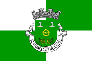 Mural crown Argent with three visible towers (village rank) and white scroll reading in black upper case serifed letters "VILA FRANCA DAS NAVES".