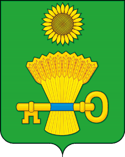 In a green field - gold: a sheaf, accompanied at the top by a sunflower flower and covered over a sash with a key placed in a belt with a beard to the right and down, changing the color on the sheaf to azure.