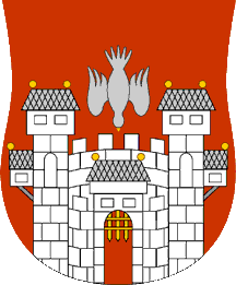 The coat of arms is based on the civic seal of 14th century. The coat of arms is shield-shaped with a red field. On the red field there is the entrance gate of a fortified castle, with open doors and lifted portcullis, issuant from the shield base. On either side of the entrance tower is a guard tower with a semicircular window, a watch tower and upper wider part. The towers have slate roofs with a golden knob on each side. The tower are connected by a machicolated wall. Between the two guard towers is a silver dove with spread wings flying downwards vertically. The towers and walls are white, the portcullis is golden.