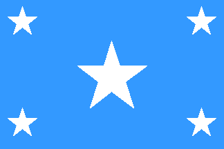 Light blue flag with a large five pointed white star in the middle and a smaller white star in each corner of the flag.
