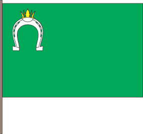 "Vert; argent horseshoe, crowned by or crown. The shield