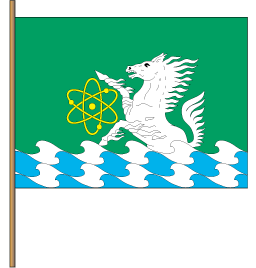 "In the rectangular green field is rising white horse, which arises from thewavy white-blue base and maintains the character of atom in yellow."