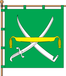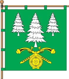 Vertically divided red-green 1:3, with a yellow ornamental trypillya on the narrow red stripe and five arrows on the green field, four white, the central one yellow.