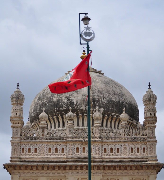 Here's another image (source). The picture caption reads: "The mausoleum housing Tipu's tomb is another example of Islamic architecture. Tipu's flag is in the foreground." And here's a better image, with a clearer inscription of the emblem in the middle (source). So, to answer Richard Sambasivam's query, there is indeed a real flag, located on the Tomb of Tipu Sultan at Srirangapattanam, Mysore, India, and #17-41b is clearly Tipu's flag.