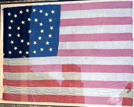 This 35-star flag is different in that it has a star arrangement of 6/6/5/6/6/6 instead of the usual 7/7/7/7/7. This 35-star is believed to be a small Tiffany flag remnant. It is an extremely rare silk flag remnant with silk thread hand-sewn gold embroidered stars, and hand-sewn stripes. The remnant of the canton measures 5" x 5" and overall size is 6.5" x 5". The stars are gold in color and were built up in a crystal pattern of five conjoined lozenges. This is also seen in "The Stars and the Stripes" by Boleslaw Mastai, page 206.