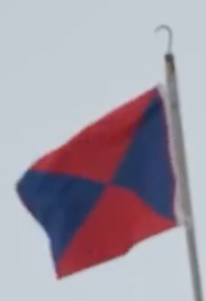 The second flag shown in the TV-report is hoisted over the hut where all the members of the community are invited to share the whale lunch. The flag is made of three "concentric" blue, white and red rectangles. It seems to be a rectangular version of the "W" flag of the International Code of Signals, most probably here for "Whale".