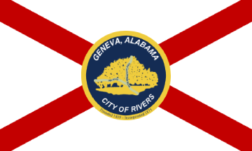 The flag was designed by resident Jerry Elmore and adopted by city council on March 2, 2020. The flag is of a white field and a red crimson St. Andrews cross, which is the base of the Alabama state flag. In the center is the Geneva city seal.
