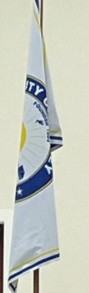 The flag is a white field with a double border of yellow and blue with the city seal in the center.