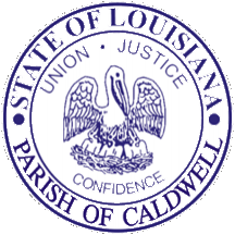 The flag of Caldwell Parish is shown at www.flags-now.com/products.php?cat=87&PHPSESSID=9d9d8d39fb55f76188f79fc7d40076c9. It is a white field with a seal showing a yellow map of the parish on a dark blue background, a green tree and a cotton boll.