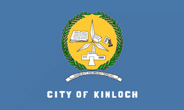 The flag has a blue background. City of Kinloch is written in white letters at the bottom. Above that it says "heaven helps those that help themselves." The city seal is a yellow circle with green leaves all around it. Inside the city seal is a white building representing the Kinloch city hall, an open book, four large leaves, and a hand holding a piece of paper that says vote.
