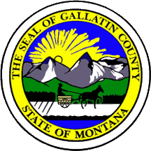 A green flag with a bundle of three yellow stripes crossing it diagonally upwards, in a zig-zag fashion, the seal of the county in the center, and the name written in the remaining green fields, GALLATIN and COUNTY.