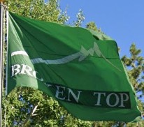 The flag is a green field with the community logo in the center.