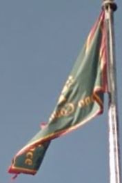 The flag is a green field with a double border of red-gold. In the center is a simplistic tree with the community name underneath.