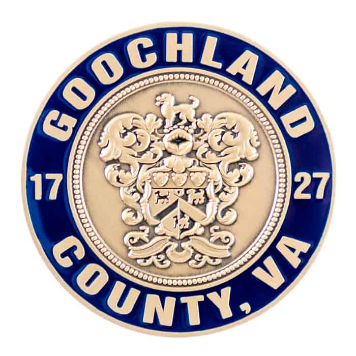 The flag of Goochland County features the county seal centered on a white field. In a circle around the county coat of arms are the words "GOOCHLAND COUNTY VIRGINIA" in black letters, with the year "1727" below the coat of arms to commemorate the county's founding.