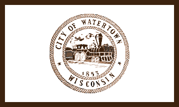 The flag of the City of Watertown, Wisconsin, is white with city logo on it. The logo is seal-like device with train in its center. In the circle around is written "CITY OF WATERTOWN / WISCONSIN". The train emblem has to do with the