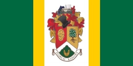 Arms: Tierce in Pairlie reversed gules Or and Argent in chief a nugget of gold and a cotton plant with bolls eradicated proper and issuant from the base of a Mount Vert representing Kadoma’s kopje charged with a representation of a Native Chief’s badge.