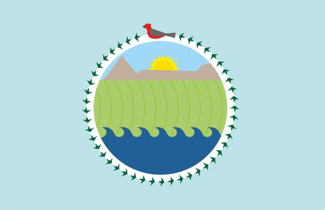 Light blue, blue, green, and brown are the predominant colors in the winning flag. It features elements characteristic of the region, such as: Churrinche, Curro, Sun, Sowing, Mountain ranges, Surf.