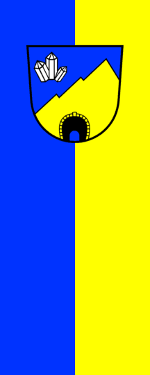 | Description of arms (German): | In Blau ein goldener, [vorne] zweimal gestufter Felsen, im Schildfuß von einem schwarz-blau geöffneten ummauerten Tunnelmund durchbrochen, rechts oben von einem silbernen dreifachen Bergkristall beseitet. [1] |