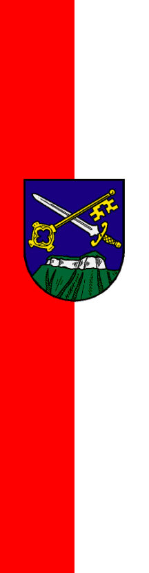 | Description of arms (German): | In blauem Schild ein langgestreckter grüner, oben felsiger und gleichfalls grünbewachsener Berg; darüber ein schrägrechtes silbernes Schwert mit goldenem Griff, gekreuzt mit einem schräglinken goldenen Schlüssel. [1] |
