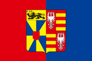 arms are "Per pale, 1. Gyronny of eight or and azur inescutcheon gules a chief or a lion passant surmounted dexter by the letters 'C.I.L.' all sable, 2. Quarterly, 1. and 4. Gules a double-headed eagle argent 2. and 3. Fessy of six gules and or".