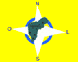 A squarish yellow flag, with blue circle centred, overlain by a white four-pointed star indicating the cardinal directions, overlain a dark green map of the municipality.