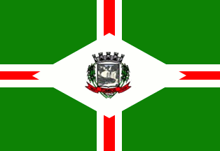 A red centred upright cross, fimbriated white, on a green field with the municipal emblem centred in a white diamond.