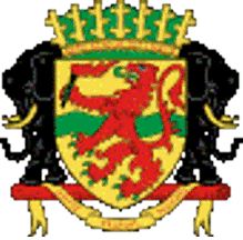 The coat of arms of the Republic of the Congo has a shield with a rampant red lion holding a torch. The background color of the shield is gold with a green, wavy, horizontal stripe along the middle. A golden crown sits above the shield. Two large African war elephants support the shield. A banner with the national motto "Unité, Travail, Progrès" (Unity, Work, Progress; translated from "La Congolaise") is draped from a bar supporting the war elephants. The arms were adopted in 1960 and readopted in 1991.