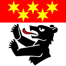 Argent a Semi Bear rampant couped Sable langued Gules and on a Chief of
