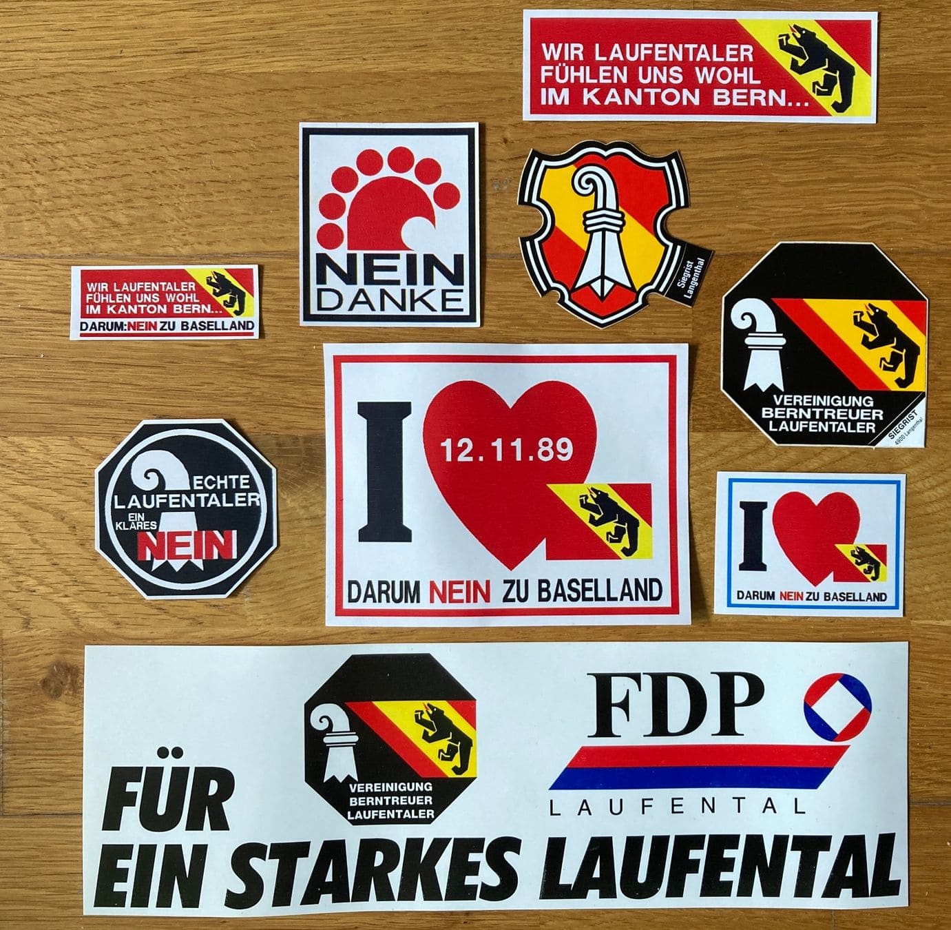 This picture shows a group of celebrating separatists with their flags in front of the Federal Court in Lausanne in 1988, which just had recognized the illegitimacy of the 1983 vote, where a majority of the Laufental voters had voted against the separation from Bern. After that vote it became known that the government of Bern had illegally given financial support to the anti-separatists (stickers). In the second vote of 1989 the separatists won (picture). The Laufental became part of Basel-Landschaft on 1 January 1994. (source)