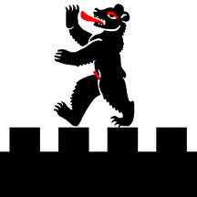 Argent a bear rampant Sable langued and viriled Gules and a base embatteled of the second.