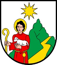 The new emblem was adopted on 18 April 2010 in a vote by the commune's population. Heraldically impeccable, St. Wendelin's crozier stands for Guttet, the mountains and the sun for Feschel.