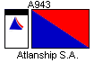 Atlanship S.A. was formed in 1982, Josef Nüsse showed a table flag for them, but it turns out to belong to the Canadian company of Atlantic Towing Ltd. So whether Josef had a flag for them and just got mixed up in the placing on his website is unclear, but it certainly has no resemblance to the Atlanship logo. However I have found one of their ships with a bow jack diagonally red over blue from lower hoist to upper fly which has the colours and a basic resemblance to the logo. In lieu of anything else to be found, this very simple flag would seem to be the house flag.