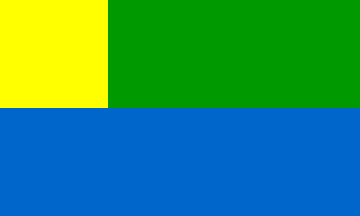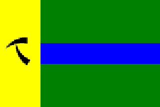 DESCRIPCION: Un campo rectangular de color amarillo con base en el asta, ocupa la cuarta parte de la longitud total de la bandera, en el centro de dicho campo va estampada una tau minúscula de color negro. El campo restante de color verde, esta atravesado por faja horizontal de color azul, de una quinta parte de la anchura total de la bandera.