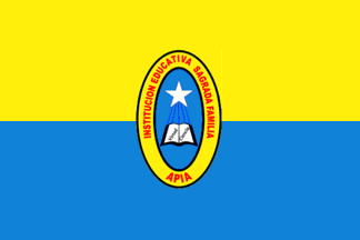 Another flag is shown graphically and described in great detail on the  institute's website. This flag is horizontally divided black-red-yellow with a half-star faceted white and black placed along the hoist. The flag is based on the national flag of Germany, the country of St. Albert the Great. The black and white star recalls the coat of arms of the Order of Preachers, founder and manager of the institute. Black and white are the colours of the cloak of the Friars Preachers; black, absorbing light and colours, is a symbol of contemplation, while white, projecting and reflecting them, is a symbol of predication. White and black are the expression of the fraternal kiss of the Colombian Caribbean race, which struggles for peace and the eradication of all kind of racial, political and religious discrimination. Red is a traditional symbol of love and sacrifice, which initiate evangelical compassion in the institute's college. Yellow is a symbol of the Gospel's light that enlightens the man's life. Yellow and red recall the sandy ravines of the town, which was awarded the title of Colombia's Golden Gate.