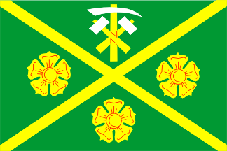 Flagdescription: green, a yellow saltire; at hoist, fly and bottom a yellow flower; in top two mining hammers with yellow haft and white head in saltire, over all a pickaxe.