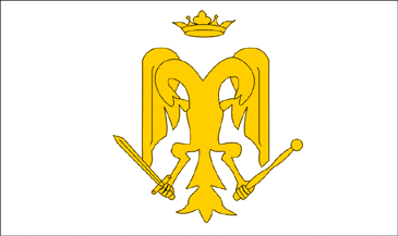 A white flag with, somewhat toward hoist, a black eagle (uncrowned) head pointed towards fly somewhat towards fly. In the fly the blue shield with the golden scepter of the Reichserbkämmerer.