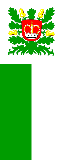 It is a green-white vertical bicolour. The coat of arms without shield is in a white bannerhead.