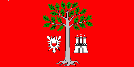 Shield Gules an eradicated oak Argent leafed Vert, flanked at dexter by the former arms of Holstein (shield parted per fess of Argent and Gules on a nettle leaf Argent)