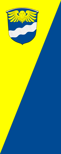 The banner is parted per bend sinister into yellow over blue. The coat of arms is in the top of the upper field.