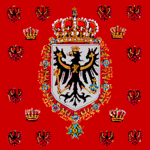 A red flag, at the center a coat-of-arms: on a silver field a gold crowned (with the Prussian royal crown) heraldic Prussian eagle (without escutcheon), surrounded by the chain of the order of the Black Eagle; at each diagonal side of the coat-of-arms, a gold crown, along each edge 4 [3?] small black eagles even spaced (a total of 12). In the upper hoist a thin Iron Cross. In use 1871-1918. Illustrated in Crampton 1990 p. 42 and Meyers Konversations-Lexikon 1912 vol. 4, facing p. 799.